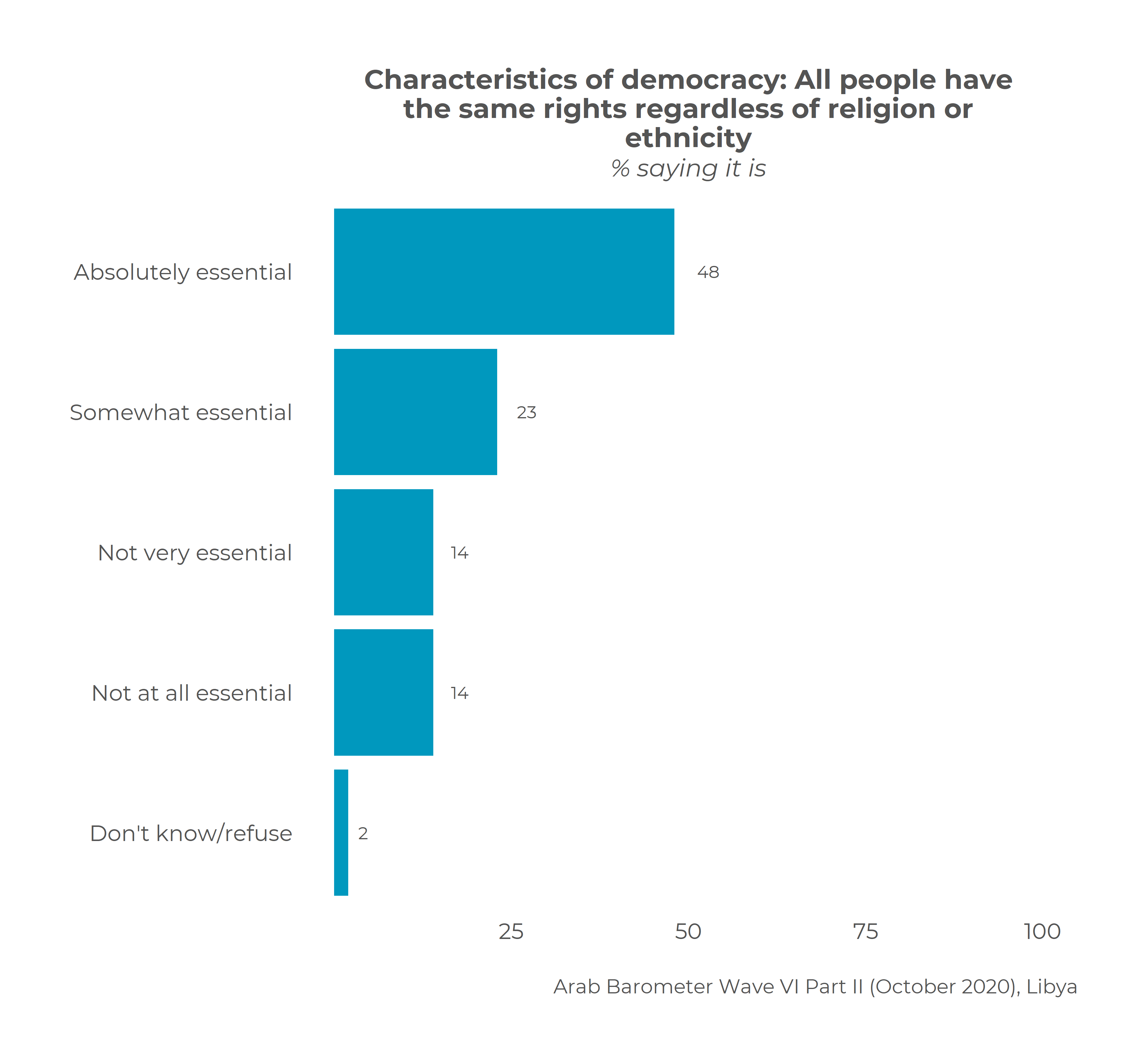 - The same percentage of Libyans say it is absolutely or somewhat essential that all people have the same rights regardless of religion or ethnicity.