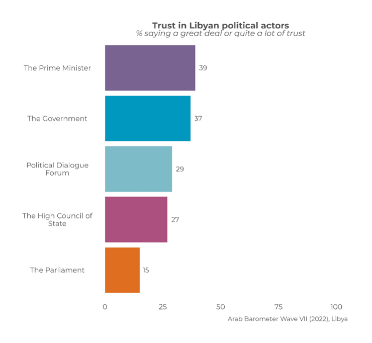 Seif al-Islam’s reported death comes at a moment when Libya’s political scene has long been marked by stagnation, uncertainty, and institutional deadlock. Arab Barometer latest available survey in Libya, conducted in 2022, indicates that public trust in political institutions and figures is highly fragmented. How Libyans respond in the coming months could influence the trajectory of Libya’s politics for years to come.