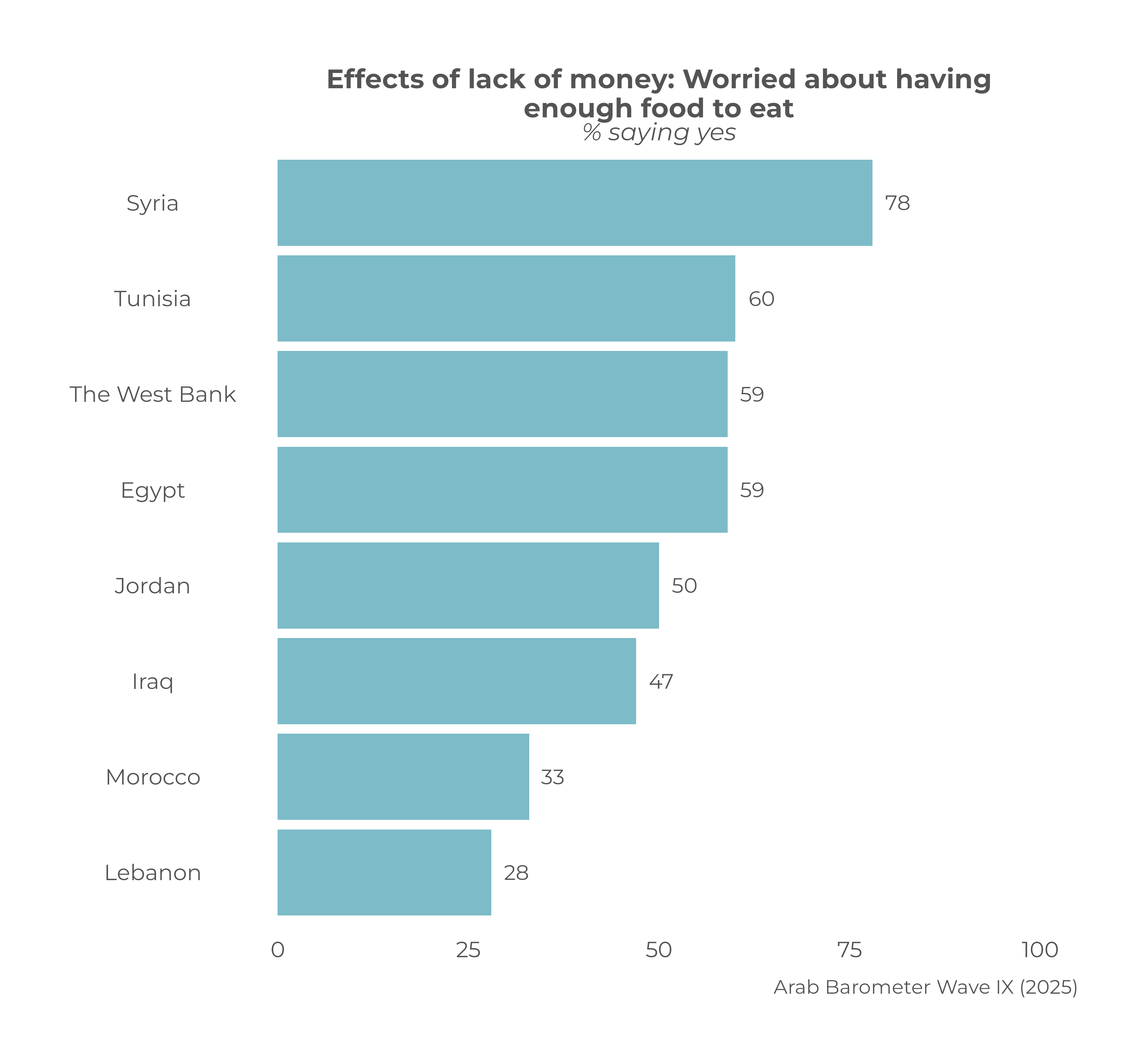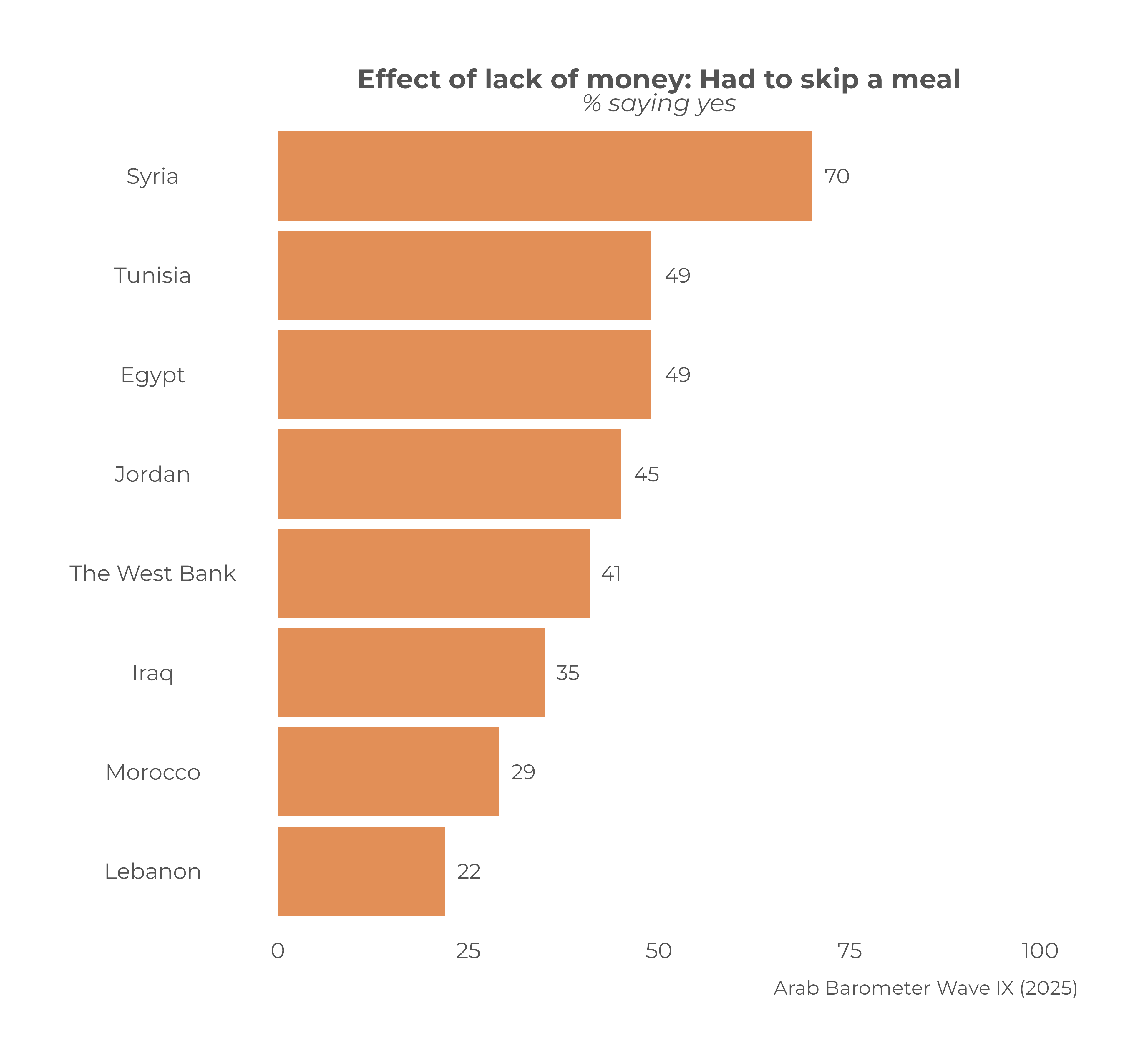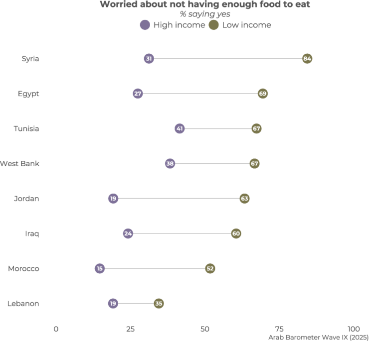 Findings from Arab Barometer’s Wave IX survey in 2025 paint a grim picture of food insecurity ahead of Ramadan. In six of eight countries surveyed, at least half report running out of food without having the means to resupply in a timely manner. About two thirds (65 percent) in Syria say this has often or sometimes been the case, as do roughly six-in-ten in Tunisia (62 percent), Jordan (61 percent), and Egypt (61 percent). This is also the experience of at least half in Morocco (56 percent) and the West Bank in Palestine (51 percent). Only in Iraq (47 percent) and Lebanon (28 percent) is this a less common phenomenon, but the numbers remain troubling.