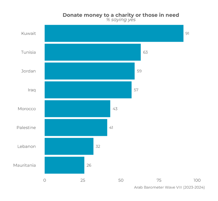 Ramadan is often framed, rightly so, as a month of solidarity, generosity, and social unity. Yet, the data suggests a more complicated and stressful reality at the micro level. Findings from Arab Barometer’s Wave VIII (2023-2024) show significant proportions of people in all countries surveyed donating to charities or those in need on monthly basis. Such generous acts typically surge during Ramadan. Yet, while charity -Zakat or others- and family networks may ease the struggle of some families temporarily, these measures cannot substitute for effective social protection systems and sustainable government policies to help those in need. The findings from Arab Barometer Wave IX reveal that the struggle to secure food is no longer an individual issue, it is an issue of governance and state performance and that is a challenge throughout the year.