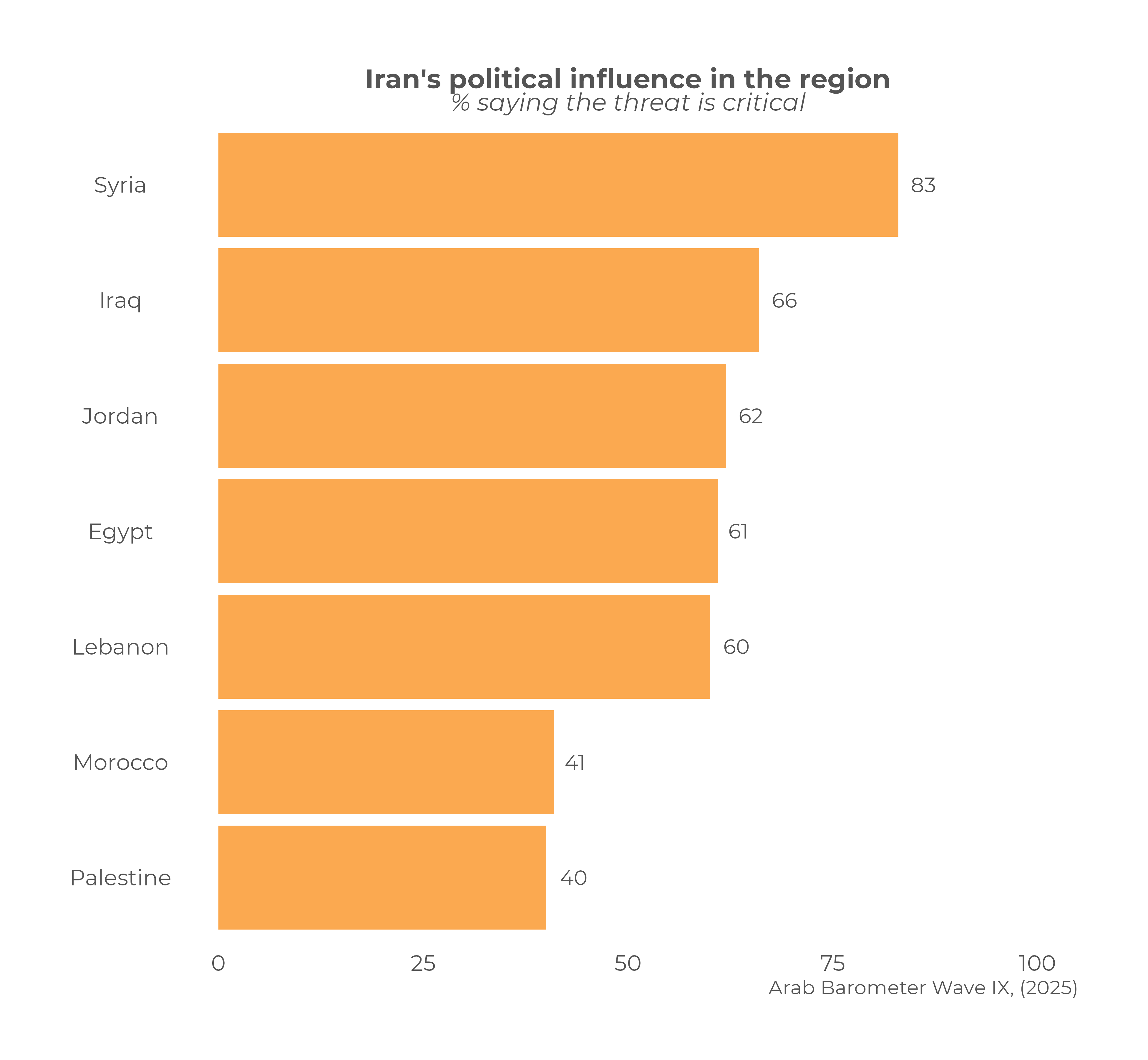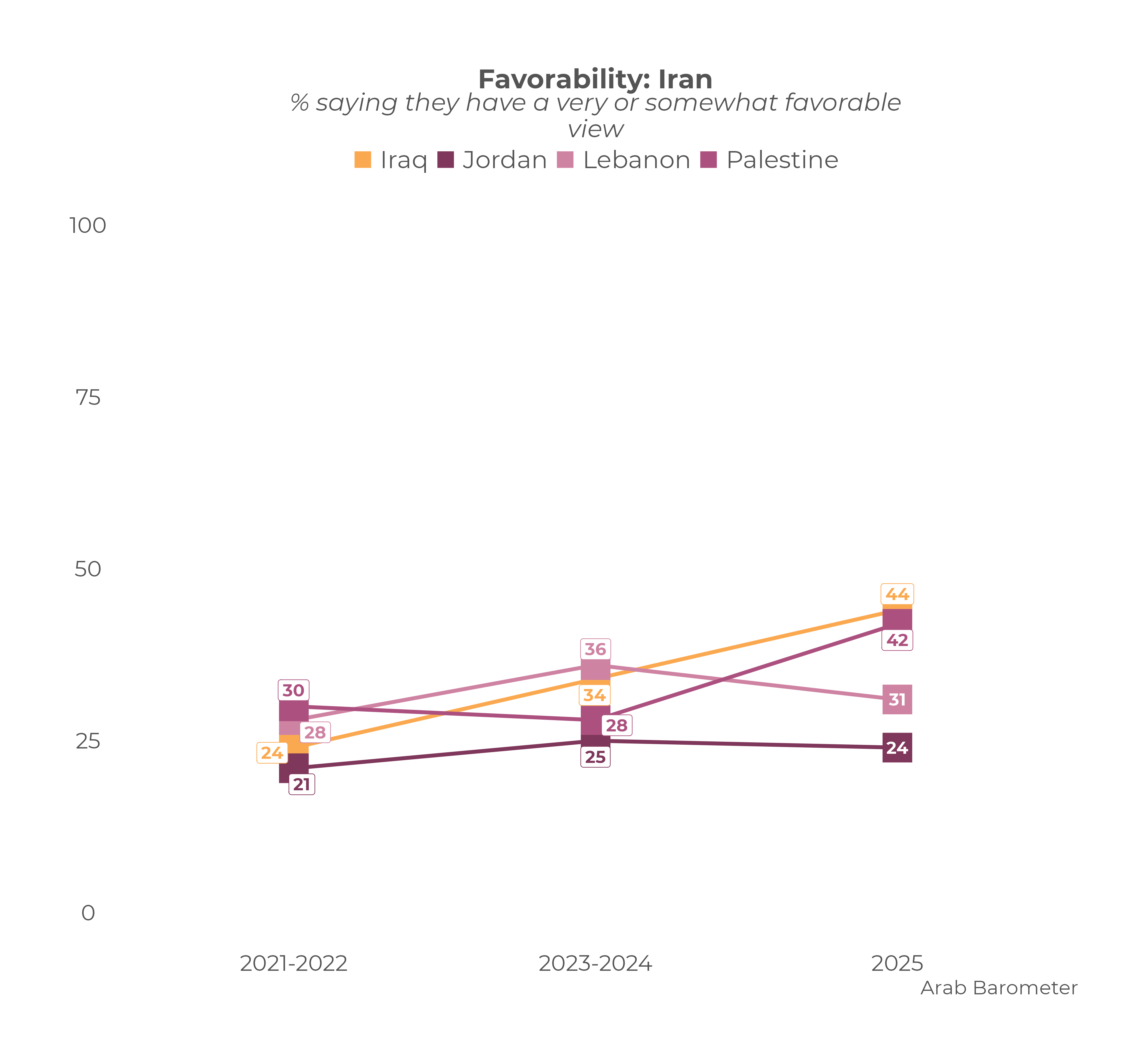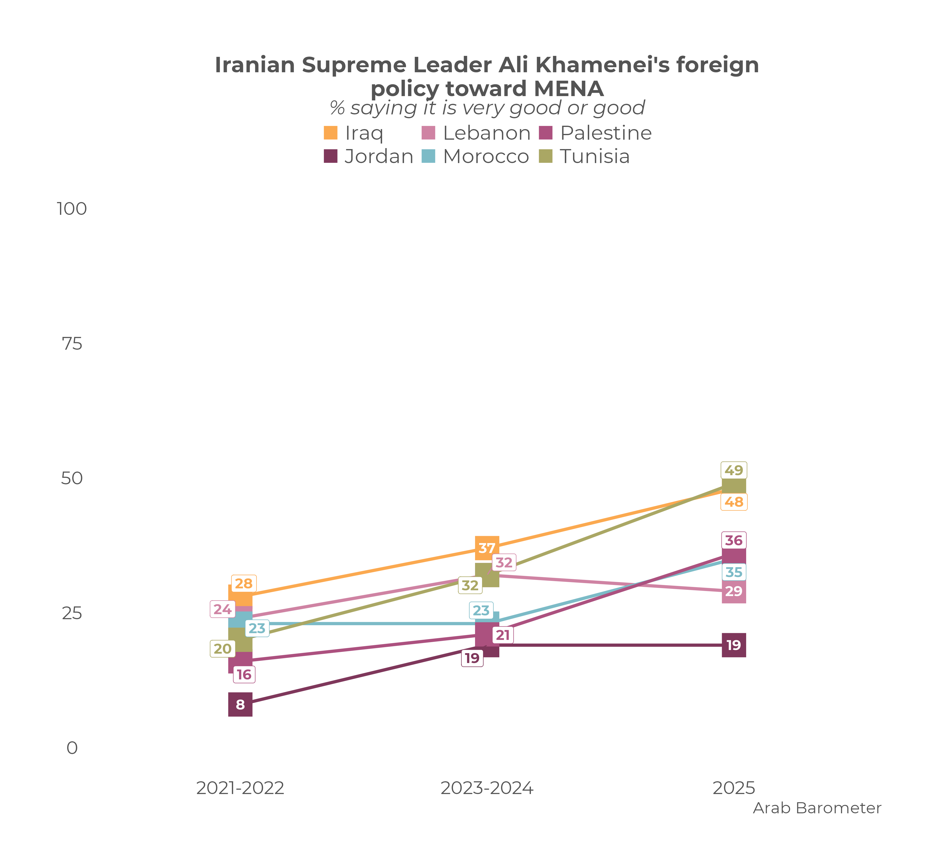 This distinction is visible in the trend data. By 2025, general favorability toward Iran rose meaningfully in in Iraq (20 points) and Palestine (12 points), while movement in Lebanon and Jordan was effectively unchanged when considering the survey’s margin of error. However, support for Khamenei’s foreign policies increased more broadly and more dramatically over the same period: by 29 points in Tunisia, 20 points in both Iraq and Palestine, and 12 points in Morocco. MENA publics, in other words, are not suddenly embracing Iran wholesale. Rather, many appear to be separating their broader attitudes toward Iran from their more specific assessment of Iran’s foreign policy.