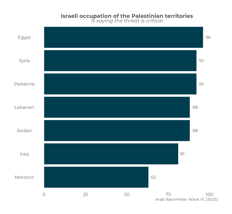 The most plausible explanation is that MENA publics weigh Iran’s support for Gaza more heavily than Iran’s nuclear policy or political influence across the Middle East.  This reality is made clear by examining views toward Israel. In six of seven countries surveyed, at least 80 percent said Israeli occupation of the Palestinian territories represented a critical threat. Even in Morocco, the lone exception, 63 percent said the same. Although Iran remains widely mistrusted, Israel’s conduct in Gaza has nonetheless become the dominant lens through which many MENA publics have come to judge regional powers.