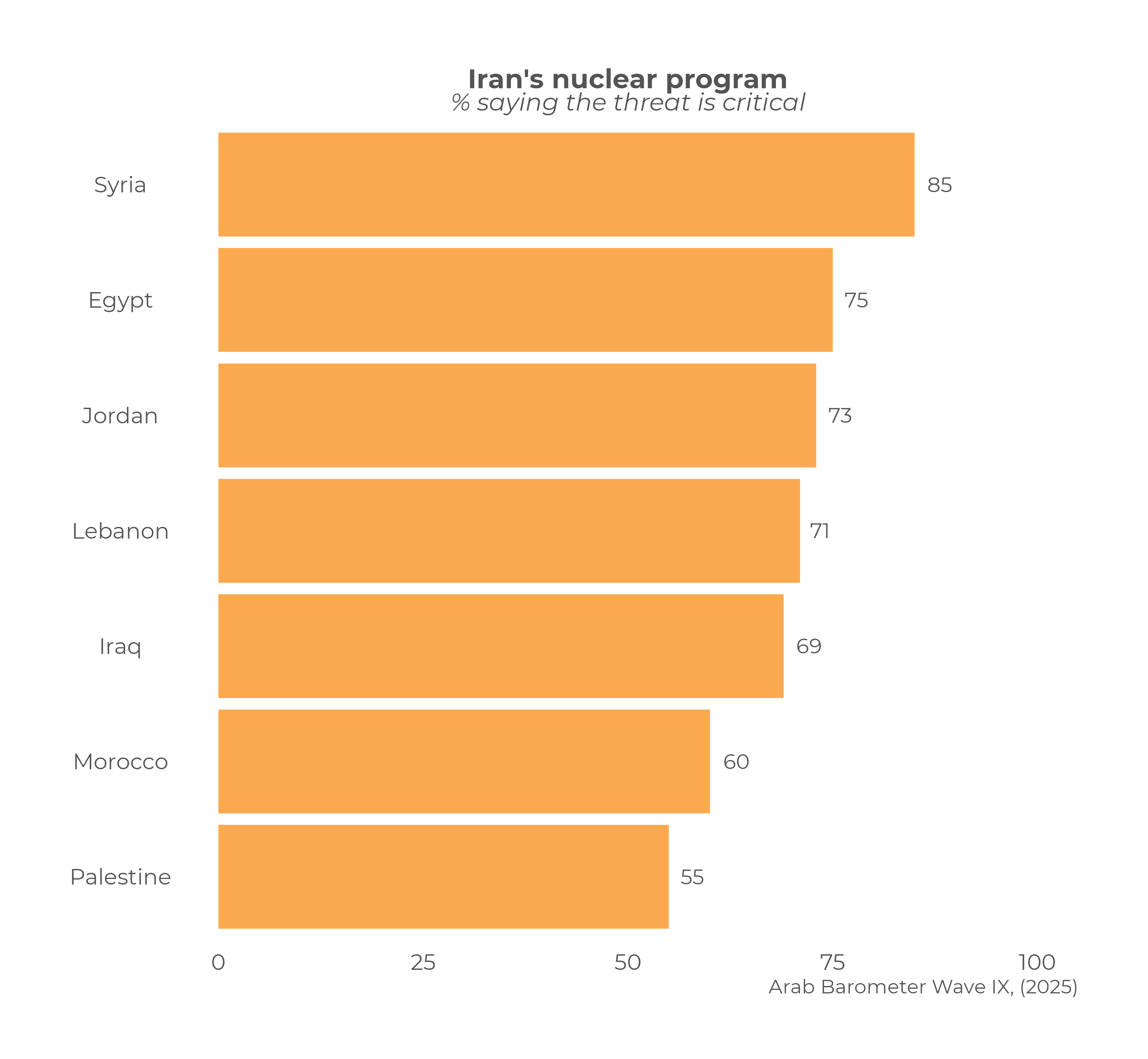 As the war involving Iran, Israel, and the United States continues to reshape the Middle East, data from recent public opinion surveys conducted in fall 2025 by Arab Barometer shed light on how publics across the Middle East and North Africa (MENA) are weighing threats, alliances, and changes in the region. Across the Arab world, many still see Iran’s nuclear program and regional influence as dangerous. Yet growing numbers also express support for Iran and, especially, for the foreign policies associated with the late Supreme Leader Ali Khamenei due to Iran’s staunch support for the Palestinian cause amid Israel’s war in Gaza. These shifts cut across Sunni-Shia lines, suggesting that public opinion is being shaped less by identity than by MENA publics’ judgments about seeking justice for Gaza.
