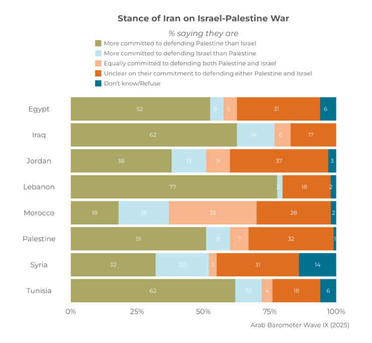 The clearest explanation for growing support for Iranian foreign policy is therefore not affection for Iran itself, but recognition of its support for the Palestinian cause. In five of eight countries surveyed, at least half said Iran is committed to defending Palestinian rights, including 77 percent in Lebanon, 62 percent in both Iraq and Tunisia, 52 percent in Egypt, and 51 percent in Palestine. Only in Jordan, Morocco, and Syria did this fall below a majority. Across the region, these figures place Iran alongside countries such as Qatar and Saudi Arabia, which are widely seen by MENA publics as the strongest supporters of the Palestinian cause.