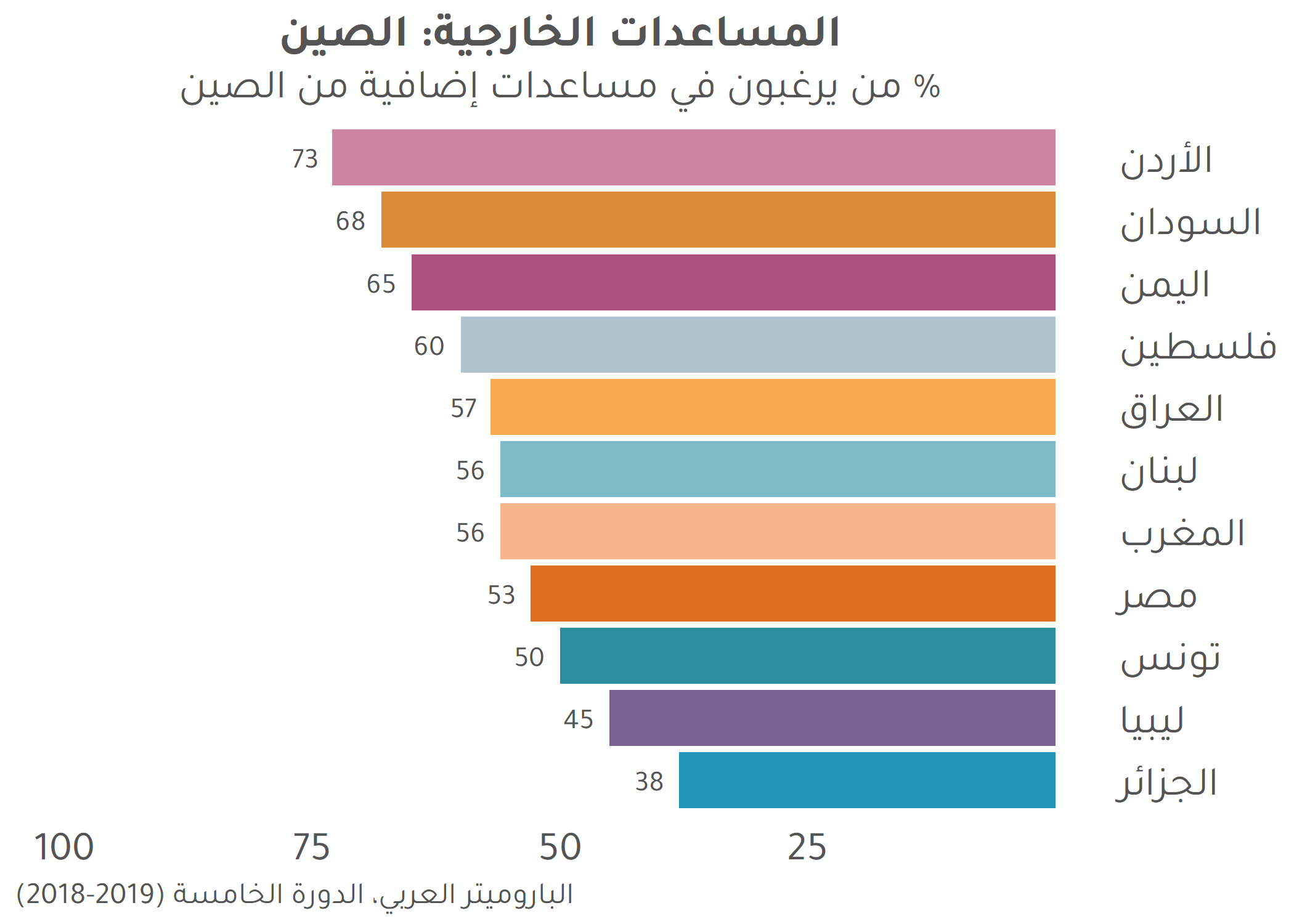 تُظهر بيانات الباروميتر العربي أن هناك انفتاحاً ملحوظاً على الصين، على الأقل في رأي المواطنين العاديين عبر المنطقة. ففي تسع من 12 دولة شملتها الدورة الخامسة من سلسلة استطلاعات الباروميتر العربي، أعرب النصف تقريباً أو أكثر عن تأييدهم لوجود علاقات اقتصادية أقوى مع الصين. يبلغ الدعم أقصاه في الأردن (70 بالمئة)، وهو البلد الذي لم ينضم بعد إلى مبادرة الحزام والطريق. وأكثر من 6 من كل 10 أشخاص يؤيدون تقوية العلاقات الاقتصادية مع الصين، في ليبيا (63 بالمئة) والسودان (62 بالمئة)، وهما البلدان اللذان تعرضا، مثل الأردن، لتحديات اقتصادية كبيرة خلال السنوات الأخيرة. على النقيض، فإن دعم تقوية العلاقات الاقتصادية مع الصين قائم بدرجة أضعف في لبنان (42 بالمئة) حيث توجد انقسامات طائفية قوية، وفي الجزائر (36 بالمئة) حيث هناك اشتباه ملحوظ في أية استثمارات أجنبية، وفي مصر (30 بالمئة).