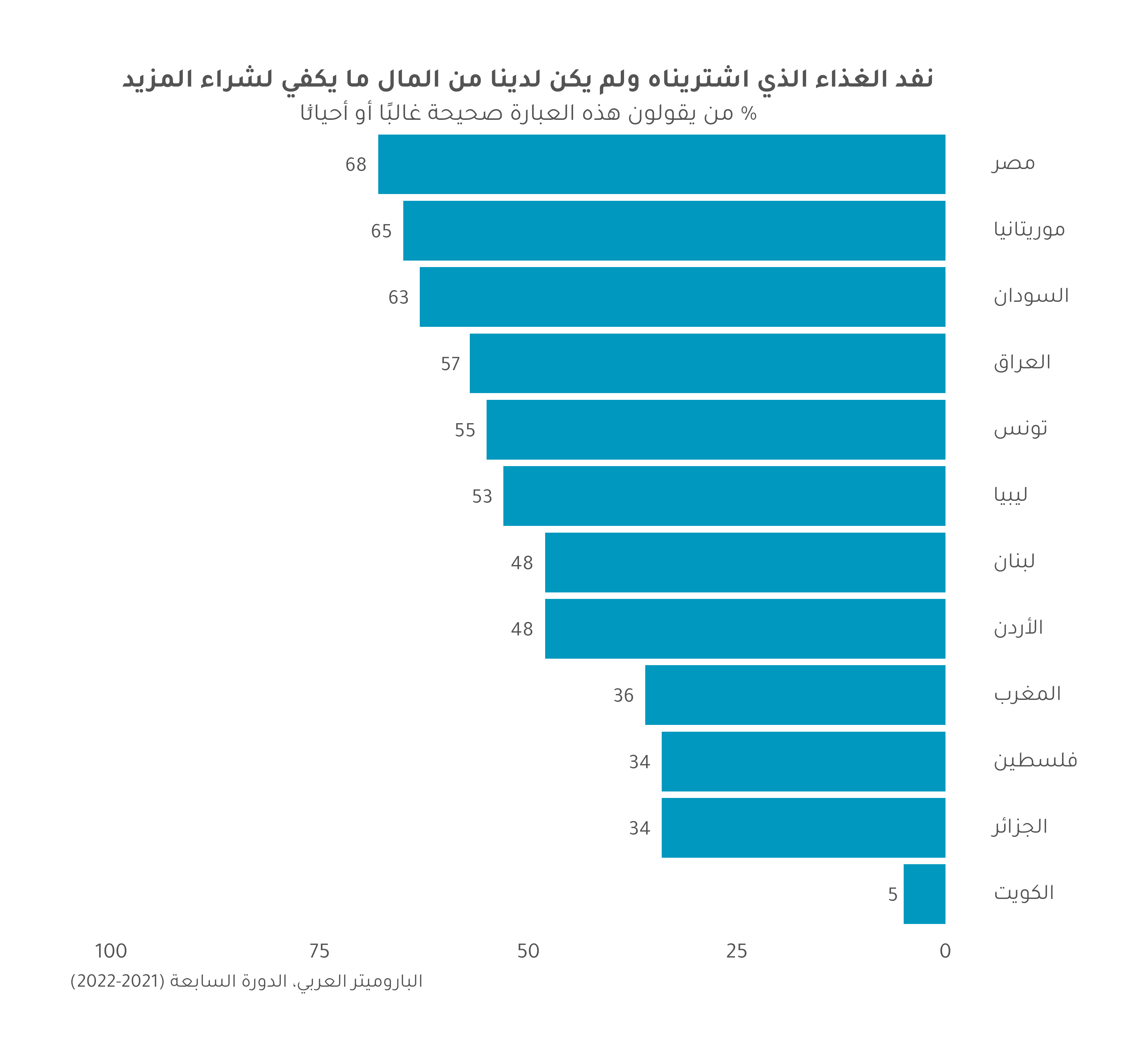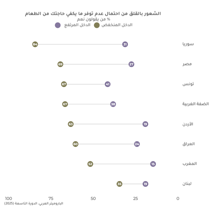 نتائج الدورة التاسعة من استطلاعات الباروميتر العربي في 2025 ترسم صورة قاتمة لمسألة انعدام الأمن الغذائي مع قدوم شهر رمضان. في ستة من ثمان دول شملها الاستطلاع، تقول الأغلبية إن غذاءها نفد قبل أن تمتلك المال لشراء المزيد. يقول ثلثا المواطنين في سوريا (65 بالمئة) إن هذا هو الحال غالبًا أو أحيانًا، كما يقول الأمر ذاته قرابة ستة من كل عشرة في تونس (62 بالمئة)، الأردن (61 بالمئة)، ومصر (61 بالمئة). يعاني النصف على الأقل من هذه المشكلة في المغرب (56 بالمئة) والضفة الغربية في فلسطين (51 بالمئة). الظاهرة تبدو أقل انتشارًا في العراق (47 بالمئة) ولبنان (28 بالمئة) فقط؛ إلا أن الأرقام تظل مقلقة في البلدين.