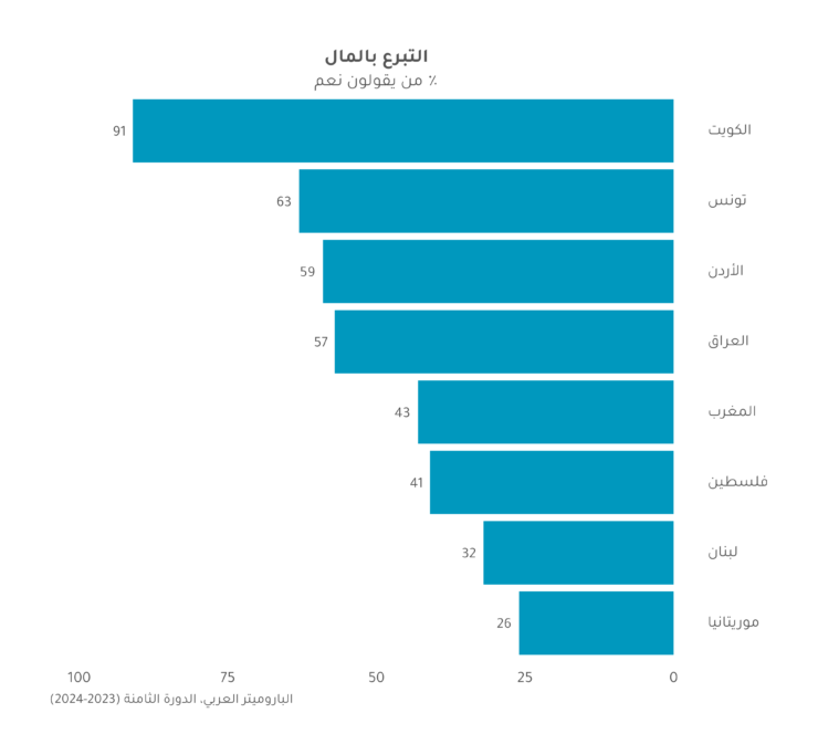 يُنظر إلى شهر رمضان عادةً على أنه شهر التضامن والجود والترابط الاجتماعي. بيد أن البيانات تكشف عن واقع أكثر تعقيدًا وصعوبةً على المستوى الفردي. تُظهر نتائج الدورة الثامنة من استطلاعات الباروميتر العربي في عامي 2023 و2024 أن نِسبًا معتبرة من المواطنين في الدول المستطلَعة جميعها يتبرعون لجمعيات خيرية أو لمحتاجين بشكل دوري. وعادةً ما تزداد هذه الأعمال الكريمة خلال شهر رمضان. ولكن، بينما تساهم المساعدات الخيرية – في صورة زكاة أو غيرها – والشبكات العائلية في تخفيف معاناة بعض الأسر مؤقتًا، إلا أنها لا تُغني عن أنظمة حماية اجتماعية فعالة وسياسات حكومية مستدامة لمساعدة المحتاجين. نتائج الدورة التاسعة من الباروميتر العربي تكشف أن المعاناة لتوفير الغذاء لم تعد مشكلة فردية، بل باتت مسألة متعلقة بالحوكمة والأداء الحكومي وهي تحدٍ عالق طوال العام.