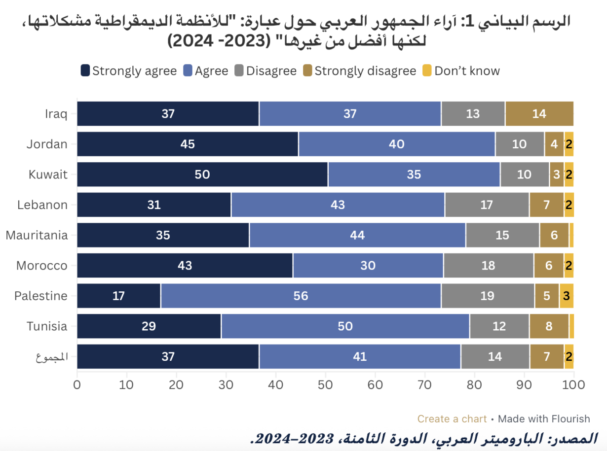 مواطنو الشرق الأوسط وشمال أفريقيا لا يزالون مؤيّدين للديمقراطية: رغم تراجع الثقة بالمؤسّسات السياسية وانحسار زخم الديمقراطية الذي رافق الربيع العربي، ما زال معظم مواطني الشرق الأوسط وشمال أفريقيا يفضّلون النظام الديمقراطي. اللافت أنّه حتى في الدول التي خيّبت فيها الديمقراطية آمال جزء كبير من السكّان، لا يُنظر إلى الحكم الاستبدادي كخيار أفضل.