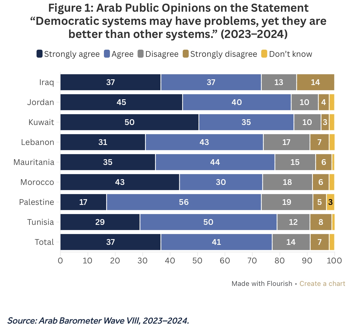 MENA Remains Pro-Democracy: Despite low confidence in political institutions, and the collapse of the Arab Spring’s democratic moment, the majority of MENA citizens still prefer a democratic government. Even in countries with widespread disillusionment, autocracy is not seen as a better alternative.