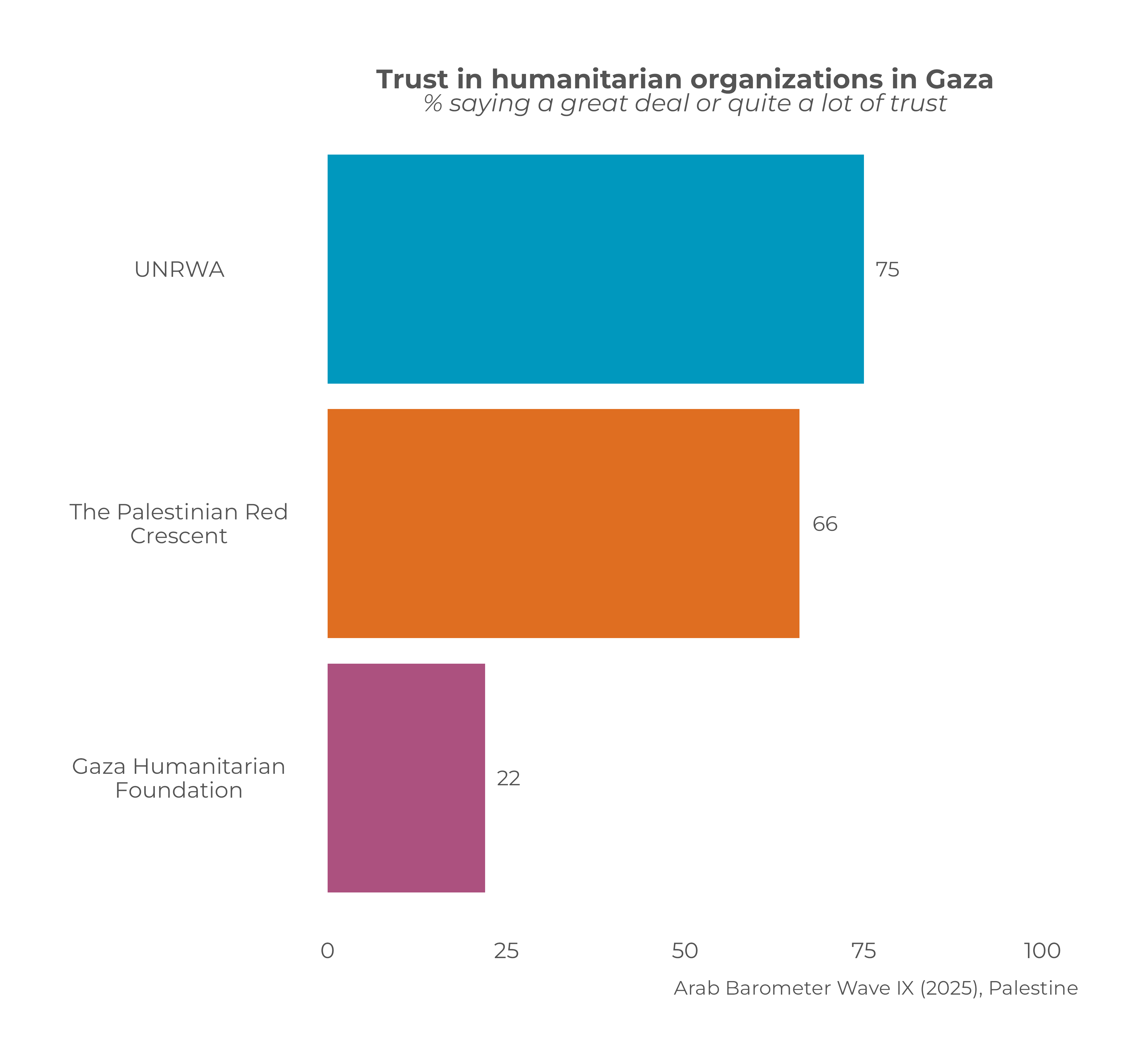 - Trust in political authorities in Gaza remains limited, with only 32% of residents saying they trust the Hamas government. By contrast, humanitarian organizations receive far higher confidence, with 75% trusting UNRWA and 66% the Red Crescent, underscoring the population’s reliance on relief actors during the war. Far fewer—just 22%—trust the Gaza Humanitarian Foundation.